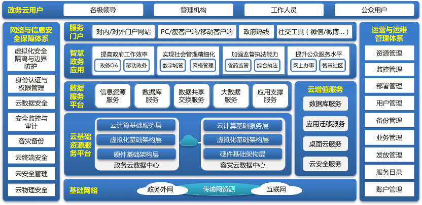 - 基础网络层,政务云计算中心运行所需要的基础网络资源,包括政务外网、互联网等,是政务云的“动脉”;