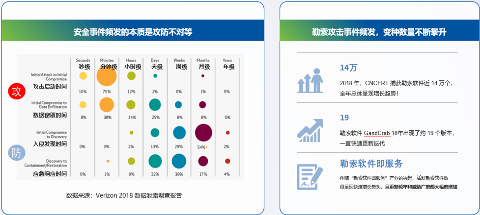 外部威胁变化太快。根据国家权威机构CNCERT披露,去年勒索软件就高达14万个,这对企业的安全工作造成了极大压力。这些威胁直接导致一个现象就是安全事件频发。