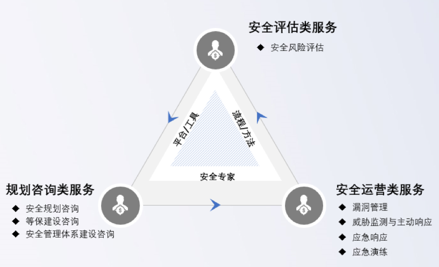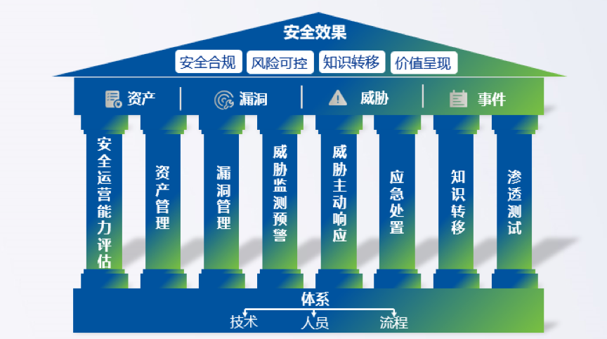 安全服务的核心是围绕着资产、漏洞、威胁、事件这四个方面去开展一系列工作。平时,我们需要把资产管理好,漏洞管理好,威胁管理好,以及持续的知识转移。