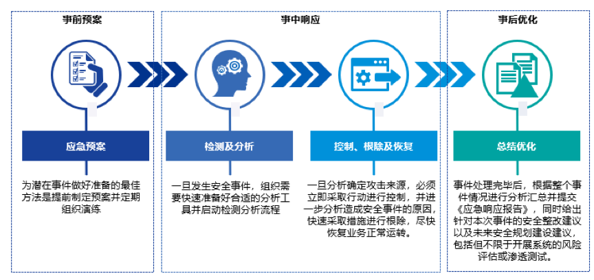 针对您出现的安全问题,我们从事前预案、事中响应、事后优化三个角度,全方位协助您建立完整的安全应急响应能力。