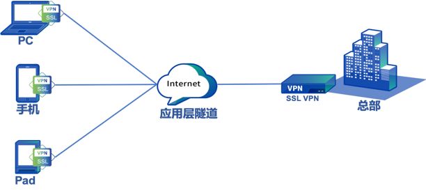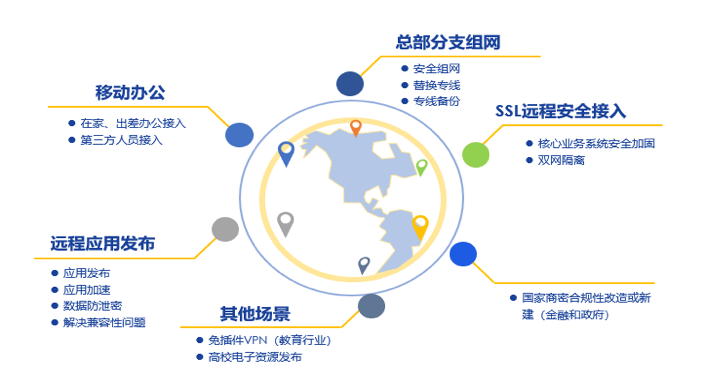 SSL VPN适用于多种移动办公场景,包括总部分支组网,员工移动办公,远程业务发布等。