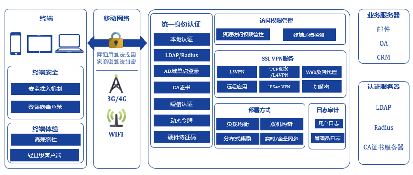 世纪黄河采用的SSL VPN移动办公方案,从终端、移动网络、认证、权限划分、日志管理等多个方面进行安全防护,帮助您实现移动办公场景下的便捷、快速、安全连接。