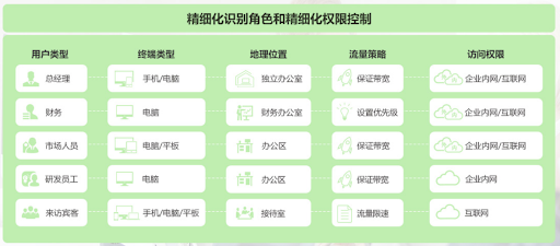 无线上网权限划分,针对不同部门、角色分配不同内网访问权限;