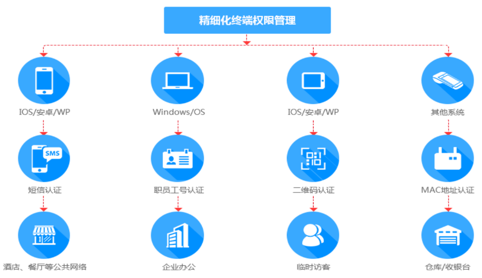 智能识别接入终端、操作系统,根据终端类型、操作系统类别设置上网权限。并结合认证方式、地理位置、时间等设定不同的访问策略,达到只能由指定终端访问的权限控制。