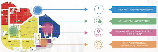 基于时间(时间段、在线时长)、地点(不同位置AP)、群组(如餐饮区、服装区等)、用户行为(出现次数)设置不同的推送内容和跳转页面,根据特定场景下用户的需求,制定个性化推送规则,降低用户对广告的反感,同时提高广告的有效性。